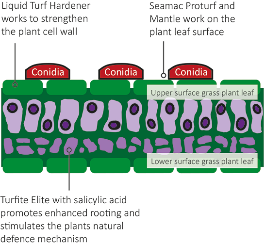 Along with aeration and changing the sward composition, application of products which are non-pesticidal i.e. they do not directly act on the pathogen - is proving to be another effective management tool. These work in a number of different ways including: